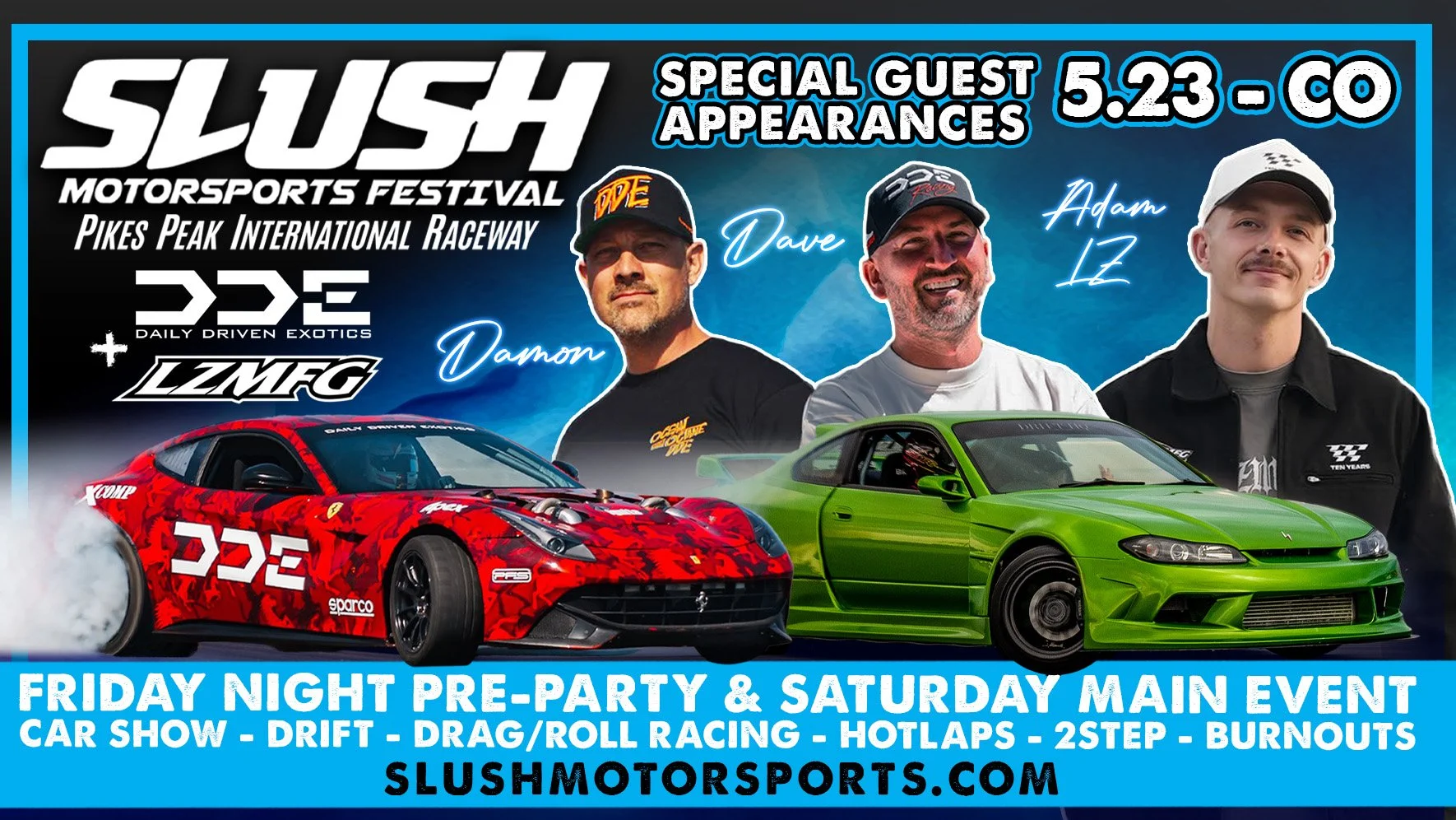SCROLL DOWN FOR ALL 2026 EVENTS & TICKETING DRIFT OFF THE STREET DRAGS TRACK SPRINTS/SUPER SPRINTS SUMMER OF SMOKE BURNOUT COMP MARCH SCCA AUTOCROSS INFO & TICKETS GALENTINES INFO & TICKETS REV N' ROAM SXS OPEN RIDE DAY SUMMER OFF THE STREETS COMING SOON DRIFT CLINIC INFO & TICKETS APRIL SPRING FLING INFO & TICKETS SUMMER OF SMOKE ROUND 1 INFO & TICKETS SCCA AUTO CROSS INFO & TICKETS MAY CO TRUCK ATTACK INFO & TICKETS DRIFT CLINIC INFO & TICKETS SCCA AUTOCROSS INFO & TICKETS SUMMER OFF THE STREETS COMING SOON SCCA AUTO CROSS INFO & TICKETS SLUSH INFO & TICKETS JUNE PEAK ADRENALINE INFO & TICKETS DRIFT CO INFO & TICKETS SCCA TIME TRIALS INFO & TICKETS SUMMER VIBES COMING SOON SUMMER OF SMOKE ROUND 2 INFO & TICKETS COLORADO HILL CLIMB TESTING INFO DOWNTOEARTH ASCEND INFO & TICKETS RMMR INFO & TICKETS SUMMER OF SMOKE ROUND 3 INFO & TICKETS JULY PORSCHE CLUB INFO & TICKETS AUGUST TRUCK ATTACK COMING SOON DRIFT CLINIC INFO & TICKETS FALL BASH COMING SOON HOT ROD ROCK & RUMBLE COMING SOON SUMMER OF SMOKE ROUND 4 COMING SOON DRIFT CO INFO & TICKETS SUMMER OFF THE STREETS COMING SOON SLANGIN SMOKE PRESENTED BY MK INFO & TICKETS SEPTEMBER DRIFT CLINIC INFO & TICKETS SUMMER OFF THE STREETS COMING SOON SCCA AUTO CROSS INFO & TICKETS OCTOBER COLORADO BIKE WEEK COMING SOON SCCA AUTO CROSS INFO & TIKETS SUMMER OF SMOKE CHAMPIONSHIP COMING SOON LADIES DRIFT COMING SOON